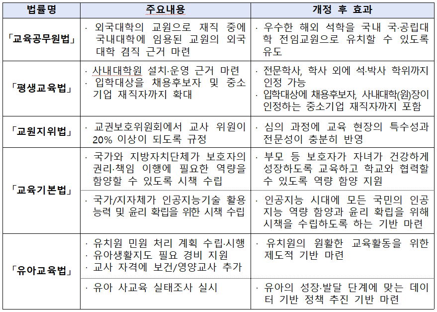 이번 개정안에는 고등교육과 평생교육, 유아교육, 교권 보호, 이주배경학생 지원 등 다양한 분야의 제도 개선 내용이 담겼다.