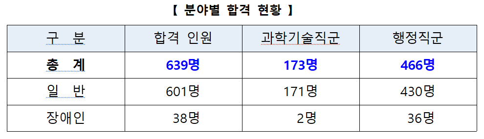 올해 합격자는 ▲과학기술직군 173명 ▲행정직군 466명으로 구성됐으며, 이 가운데 장애인 구분모집 합격자는 38명이다.