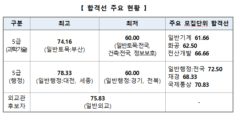 가장 높은 합격선은 일반행정 직렬 중 대전·세종 모집 단위로 78.33점이다. 행정직 전국 모집 기준으로 보면 일반행정은 72.50점, 재경은 68.33점, 국제통상은 70.83점으로 나타났다. 다만 주요 직렬 대부분에서 전년도 대비 합격선이 하락하는 흐름이 확인됐다.