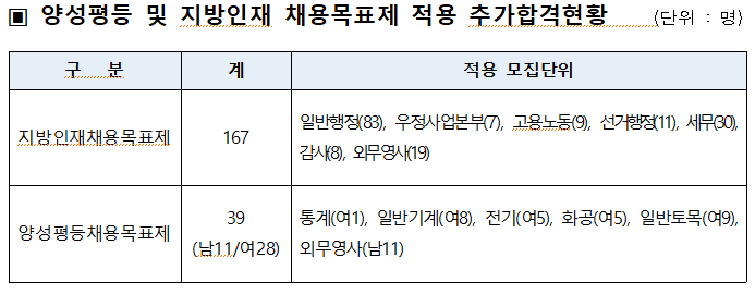 지방인재채용목표제를 통해 일반행정, 고용노동, 외무영사 등 7개 모집단위에서 167명이 추가 합격했으며, 양성평등채용목표제를 통해 통계, 화공 등 6개 모집단위에서 남성 11명, 여성 28명 등 총 39명이 추가로 합격했다.