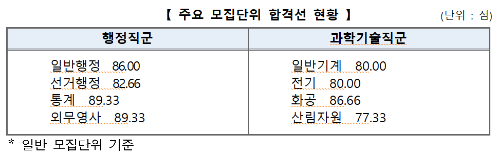 행정직군 주요 모집단위 중 합격선이 가장 높은 직렬은 통계와 외무영사로 89.33점을 기록했다. 일반행정은 86.00점, 선거행정은 82.66점으로 나타났다.
